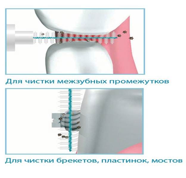 - Подходят для чистки брекетов, мостов и зубных протезов.